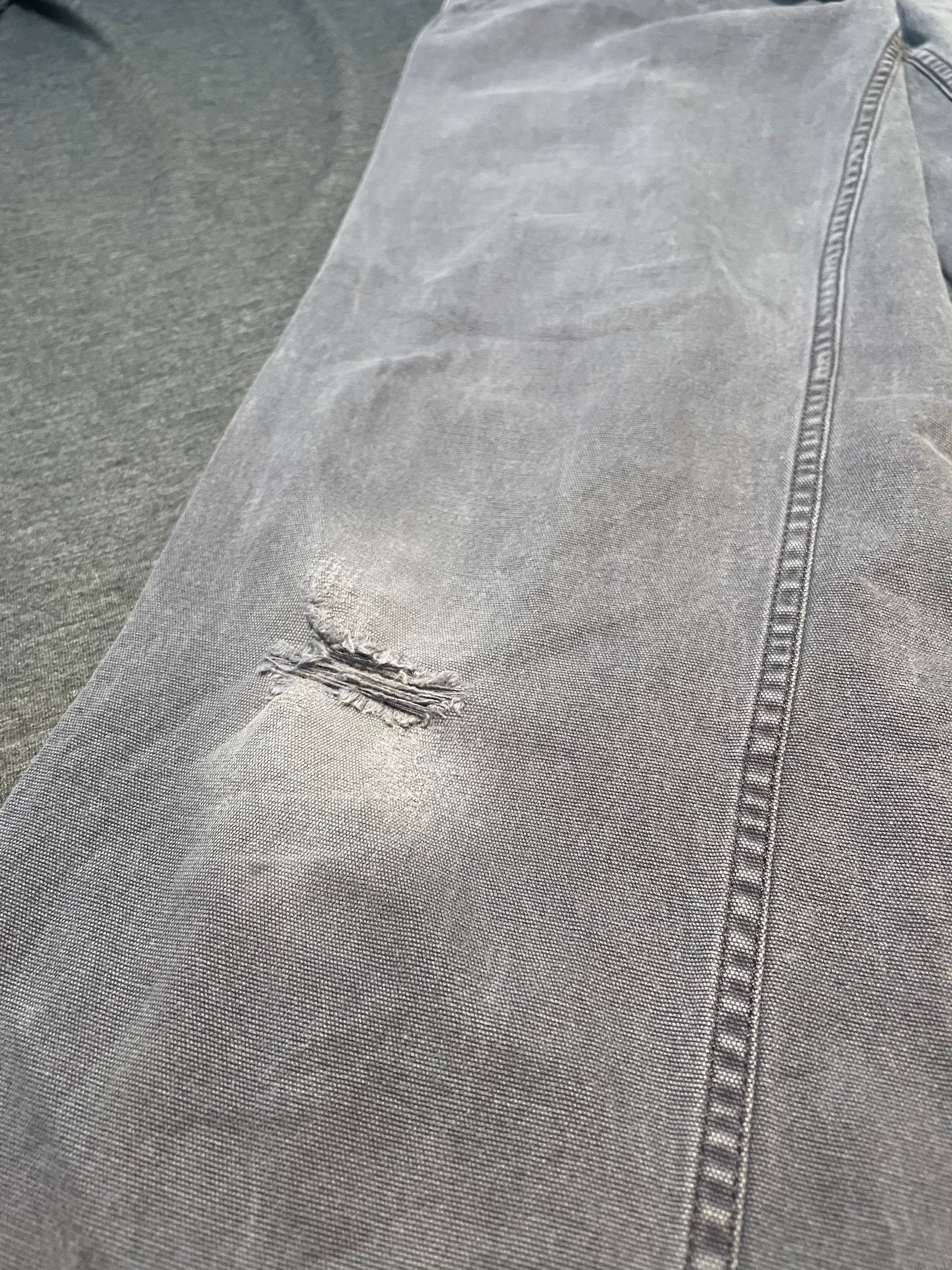 Distressing throughout, carpenter style chino. Hole on left knee. Authentic Workwear style.