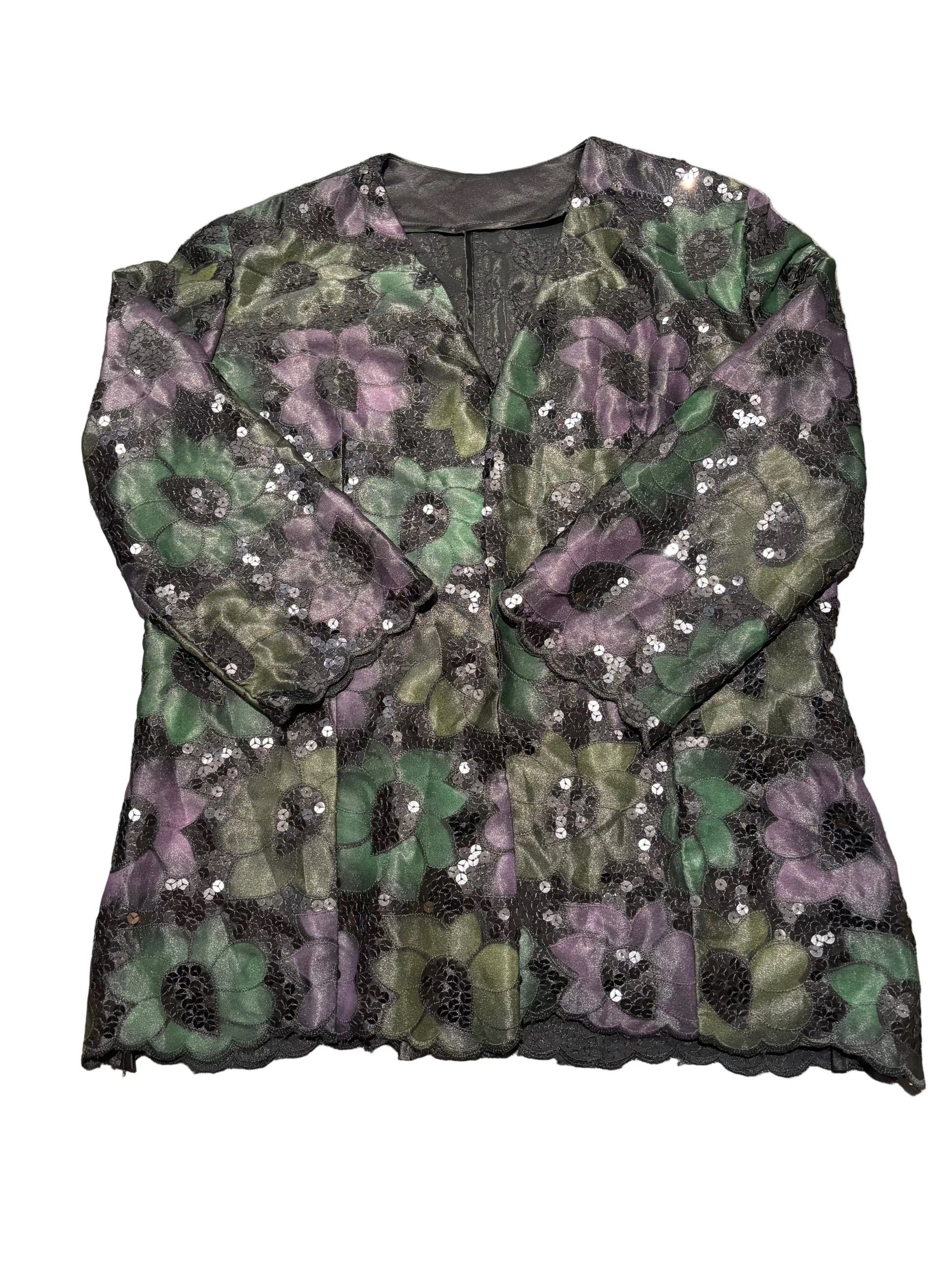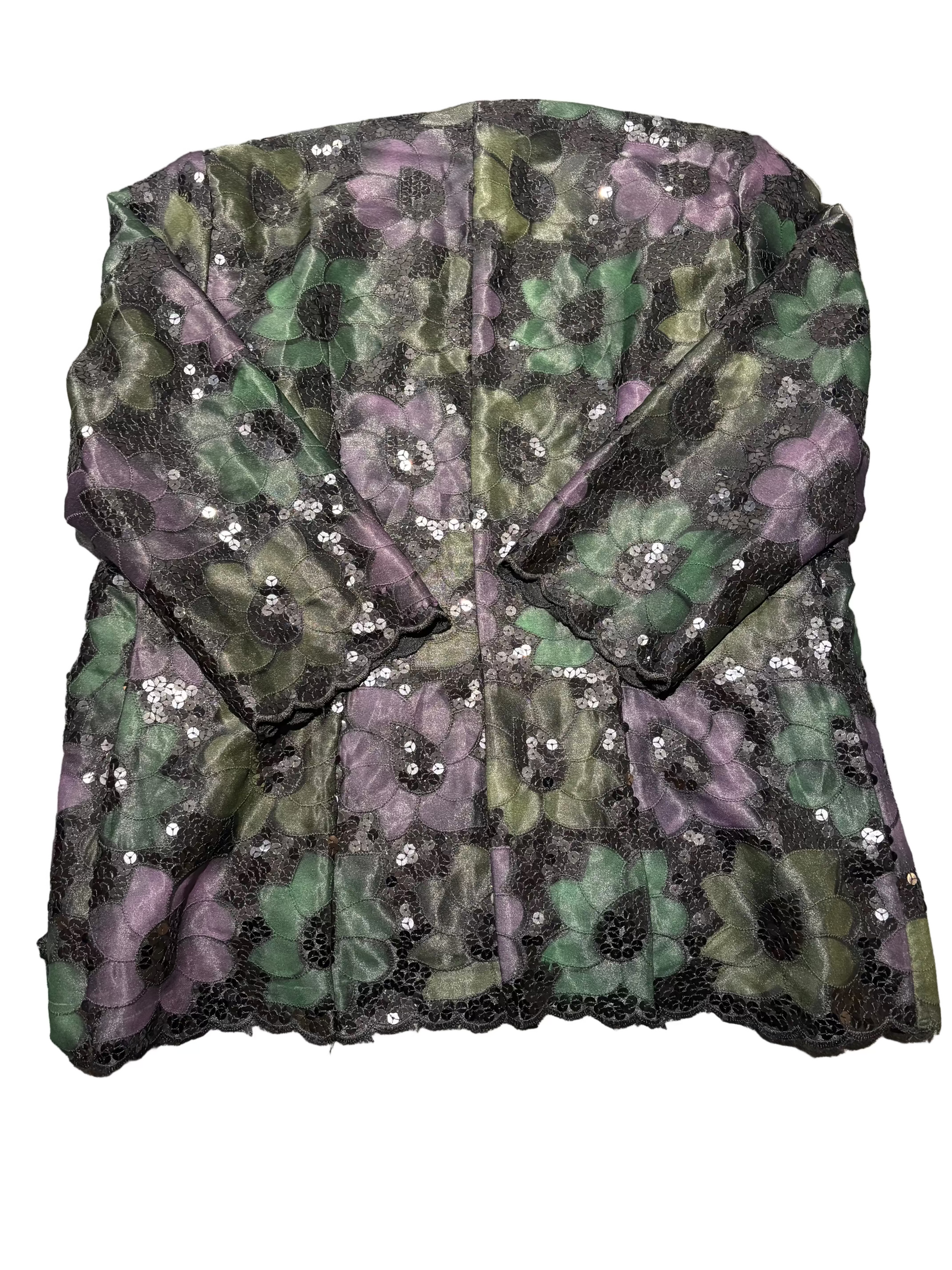 Step into the disco era with this stunning sequin floral shirt that screams 70s glamour. Adorned with shimmering sequins and vibrant floral patterns, this size M beauty is perfect for vintage lovers and retro enthusiasts. Whether you're channelling Studio 54 vibes or adding a statement piece to your collection, this shirt delivers instant sparkle and nostalgia. A true showstopper that transforms any outfit into a groovy celebration of vintage style.
