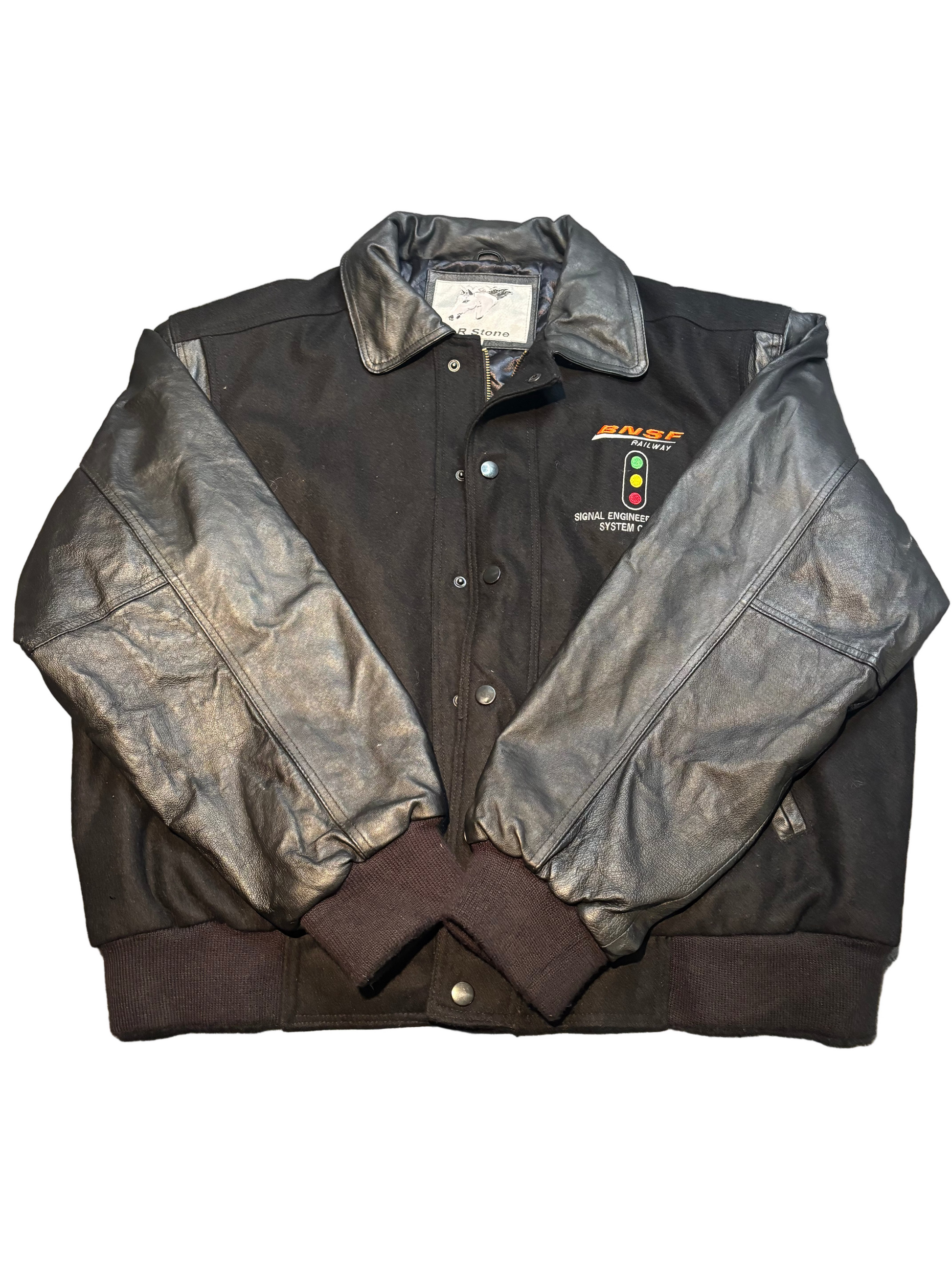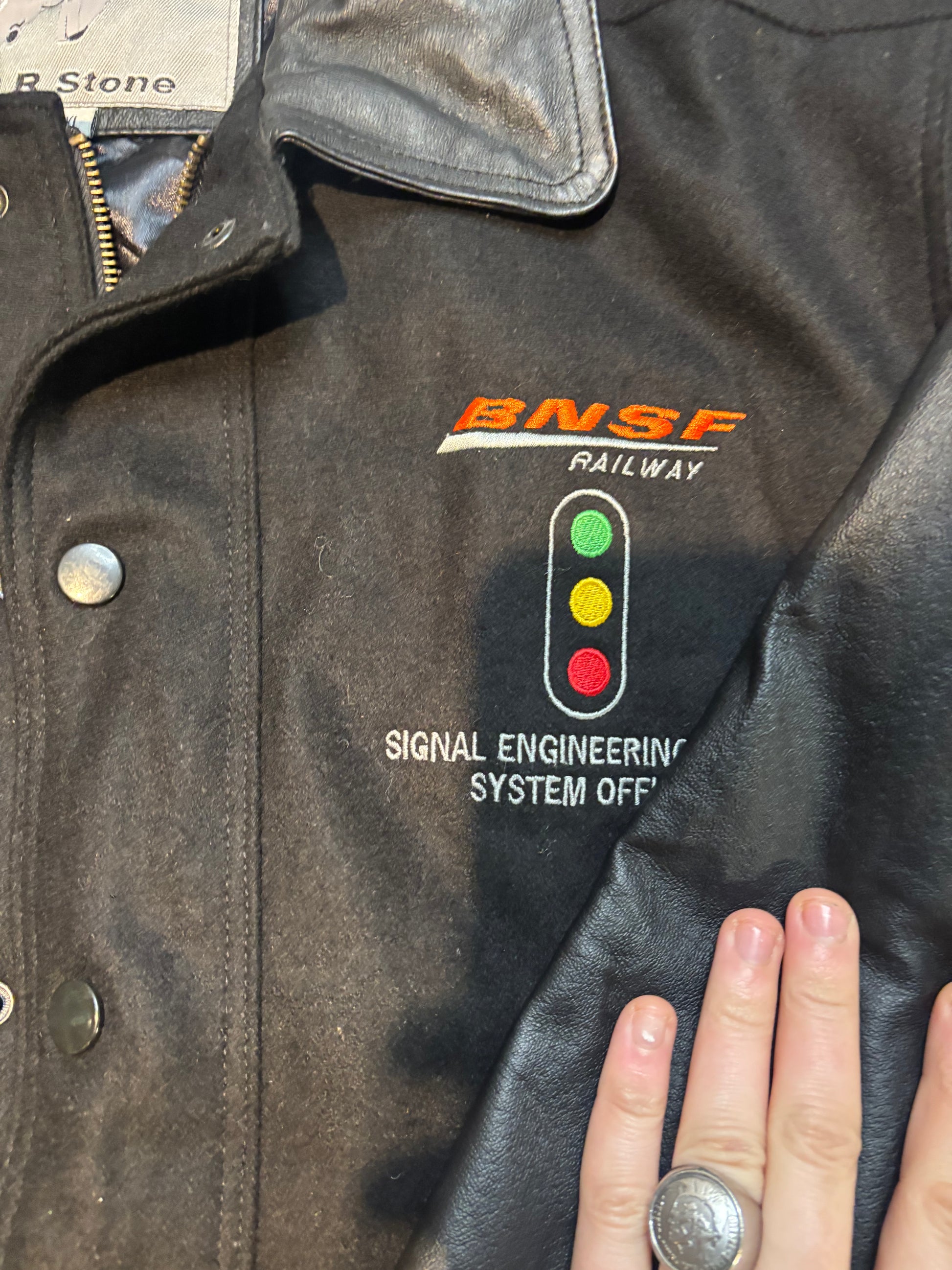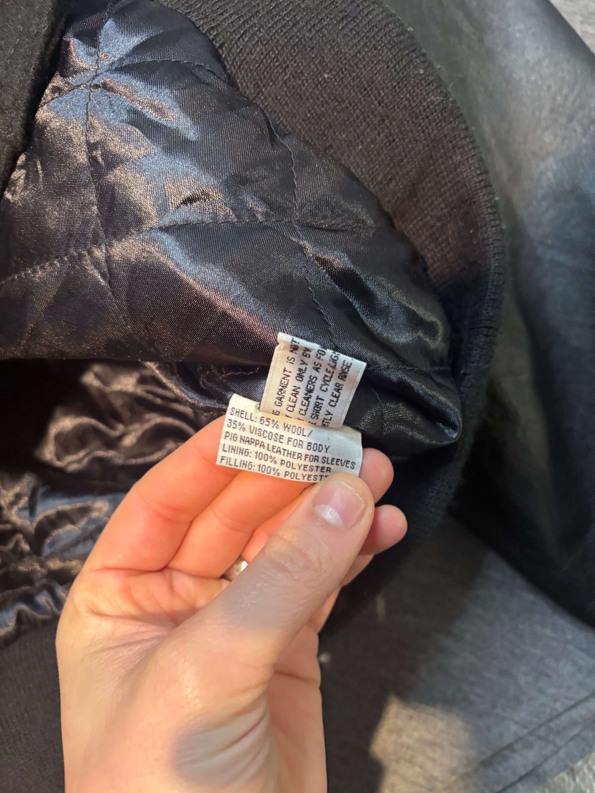 Leather sleeves, wash tag pictured, front embroidery. Quilt lined for warmth. XL